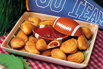 Lightly grease baking sheet(s); set aside. If using loaf of dough, divide loaf into 12 equal slices. If using rolls, they are ready to use once thawed. On a lightly floured surface, pat or roll each piece of dough out to a circle 4-inches in diameter. Place dough rounds on greased baking sheet(s) 2-3 inches apart. Top each dough round with 3 pieces of Bridgford Pepperoni, placing the pepperoni on the left side of the circle. Fold right side of dough circle to the left over filling so that edges of dough are touching. Pinch to seal seams. Brush dough with oil or butter. Let rise in warm area until puffy. Bake in a preheated 375º oven for 12-15 minutes or until golden brown. Remove from oven and brush with additional oil or butter. Let cool on wire rack.