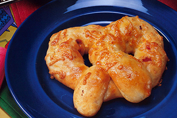 Lightly grease large baking sheet(s). Place thawed loaf into a food processor fitted with blade. Add Bridgford Pepperoni. Process with blade for 10-15 seconds in pulse mode. Process just enough to knead the pepperoni evenly into dough. (If you do not have a food processor, let the dough rise until puffy, then knead the pepperoni into the dough). On a lightly floured surface, reform dough into a log shape. Roll dough lengthwise into a 15 x 5 ” rectangle. Cut dough into 8 equal long strips. Take a 15″ dough piece and roll between the palms of your hands to a 20″ long rope. Shape each rope into a “U” shape and place on prepared pan. Take the right end of the rope and place it over the bottom left hand corner of the “U”. Repeat with the left side. Brush dough with melted butter or margarine. If desired, sprinkle each pretzel with 2 tablespoons cheese. Bake in a preheated 375° oven for 14-16 minutes or until golden brown. Remove from oven and pan to wire rack. Serve warm. If desired, serve with pizza sauce for dipping.