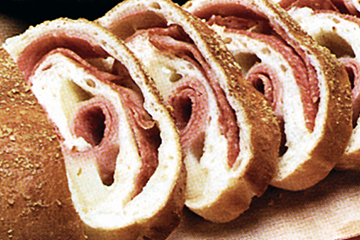 Divide dough in half. On a lightly floured board, roll each dough piece out to a 9-inch square. Cover dough with layers of pepperoni or salami, cheese and ham. Roll each piece of dough up tightly jelly-roll fashion. Using a little flour on fingers, pinch ends and long edge of dough roll tightly to seal filling in. Place rolls on a lightly greased baking sheet. Brush with egg and sprinkle with grated cheese. Bake immediately at 350° for 25-30 minutes or until well browned. Remove from pan immediately to cool slightly. Slice thinly for appetizers.